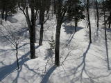 | このスキーの溝の跡は、 岩手県の松尾八幡平から 八幡平山頂を通り秋田八幡平スキー場への 山スキーコースを滑ってきた人たちの物です。 ボードだとまだ雪が軟らか過ぎて行けません。 少しなだらかな斜面で時々歩きましたが、 五所掛温泉の入り口まで、ボードで滑りました。 雪が積もった道は狭く感じますよ! いい体験が出来ました。 |